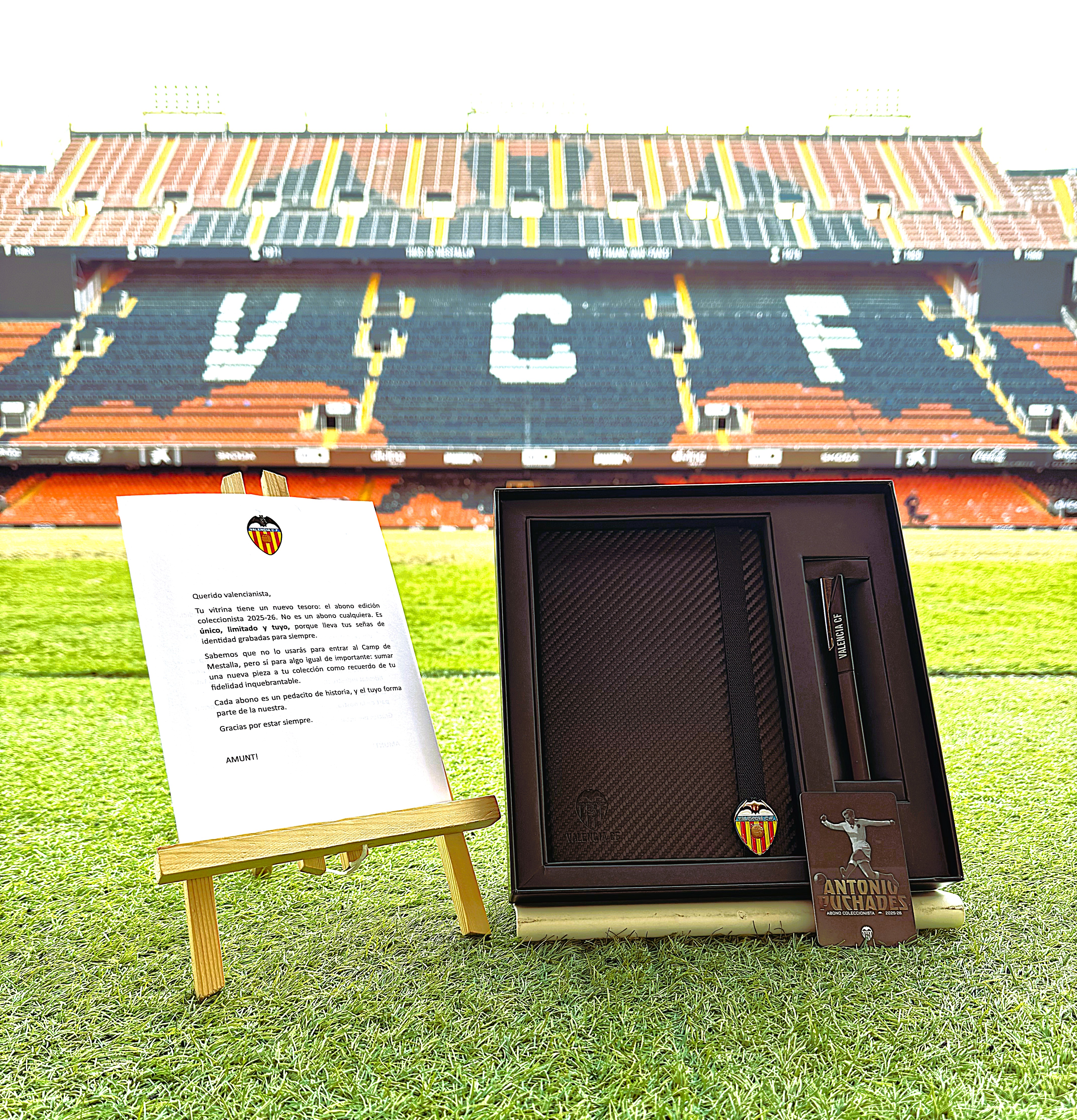 Con el Pack Abono Coleccionista, además de tu abono personalizado con tu nombre, apellido y número de Socio VCF con los detalles impresos de la temporada 2025-26, incluirá una caja que contiene un bolígrafo y una libreta premium con el escudo del Valencia CF para todo un valencianista | Precio: 15 euros (efectivo o tarjeta).