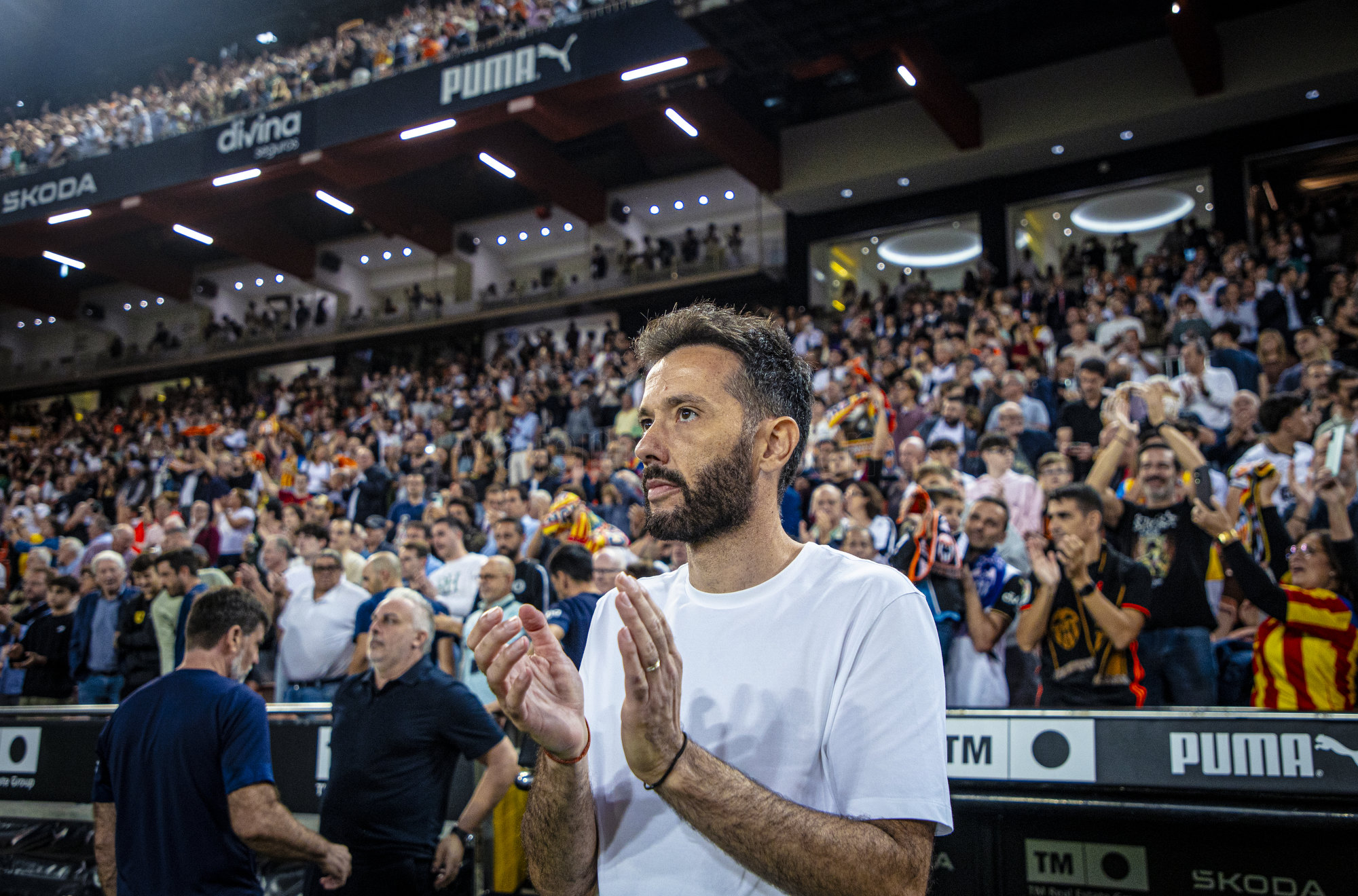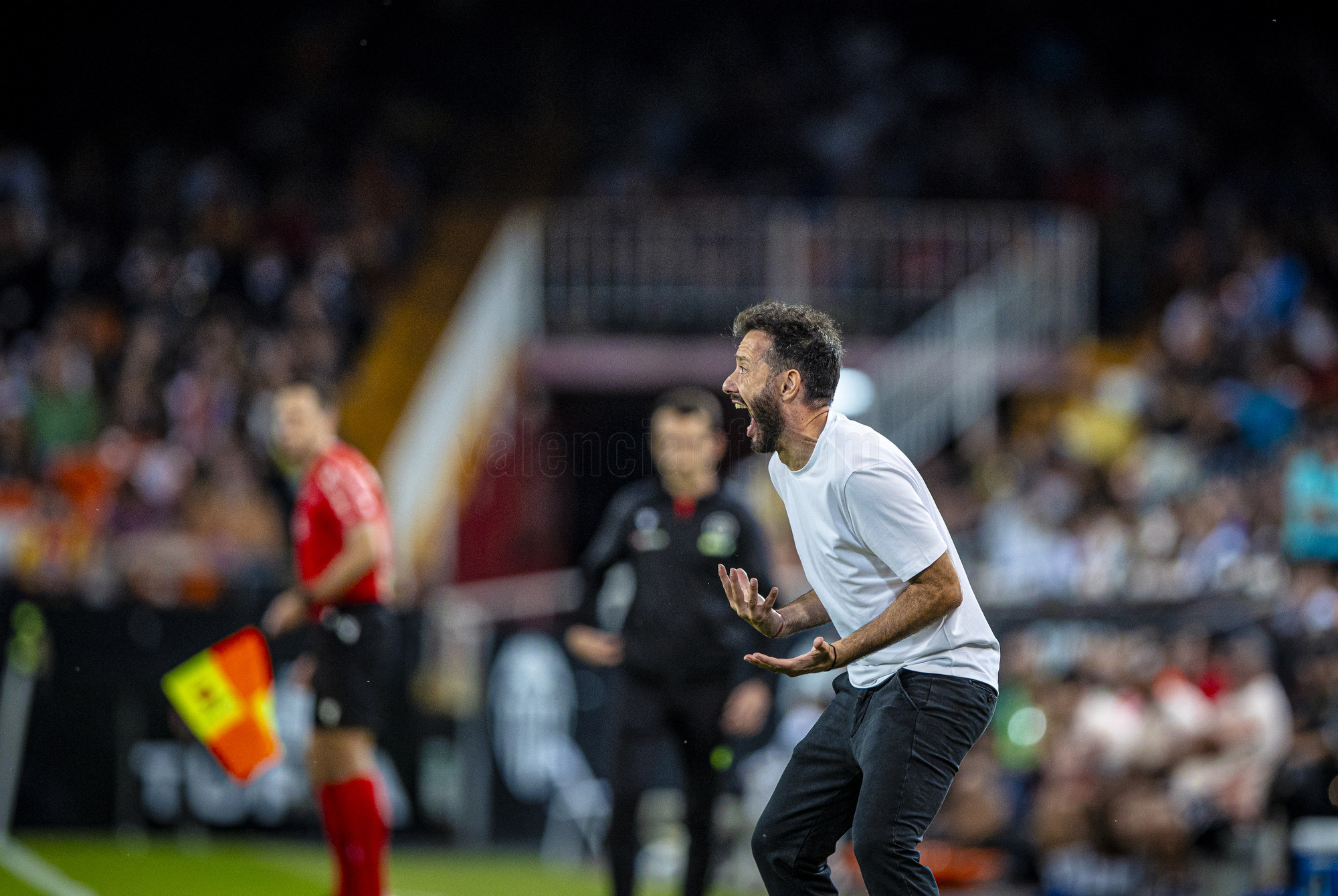 “Sin ninguna duda, a partir del minuto 15 el equipo se ha desajustado. Santamaría ha empezado a perder la posición en medio campo, Javi Guerra ha empezado a atacar de lateral, Foulquier ha empezado a atacar de volante, Rioja parecía más un lateral y el equipo ha perdido posiciones vitales para dominar el partido. En ataque, hemos ido atacando cada vez peor y eso permitía contras del rival. En defensa, cuando hemos ido a presionar nos han superado en duelos y cuando hemos defendido en campo propio nos han encontrado entre líneas y han cambiado la emoción del partido. Hoy no siento que esto haya sido por un ajuste del rival. Hoy ha sido un desajuste del Valencia CF y no un ajuste del Real Oviedo. Habrá que ver porqué ha sido el desajuste y, básicamente, por que no hemos respetado las posiciones ofensivas que teníamos. Muchas veces uno se puede confundir en el partido y sentir que es fácil hacer más cosas de las que tiene que hacer. Creo que es difícil generalizar y es necesario individualizarlo. ¿Por qué hemos perdido la posición en medio campo? ¿Por qué no hemos atacado los espacios que teníamos que atacar? ¿Por qué no hemos dado continuidad a la idea que tan bien estaba funcionando los primeros minutos? Lo que ha pasado esta claro, pero no podemos hacerlo si queremos ser un equipo más competitivo. El dolor es enorme. En un partido aplazado por la lluvia para un martes por la noche, vienes a Mestalla y hay más de 40.000 personas. Eso nos fastidia una barbaridad. Eso es doloroso. Ante eso no es cuestión de un análisis táctico, es una cuestión de que tenemos que competir mejor, darle más continuidad, estar más organizados y encaminar y dirigir un partido como tenemos que hacerlo”.