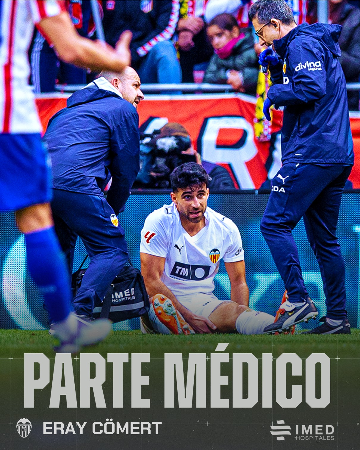 Després de les proves efectuades, el jugador del Valencia CF, Eray Cömert pateix una lesió a la musculatura abdominal patida durant el partit del passat dissabte enfront de l'Atlètic de Madrid.