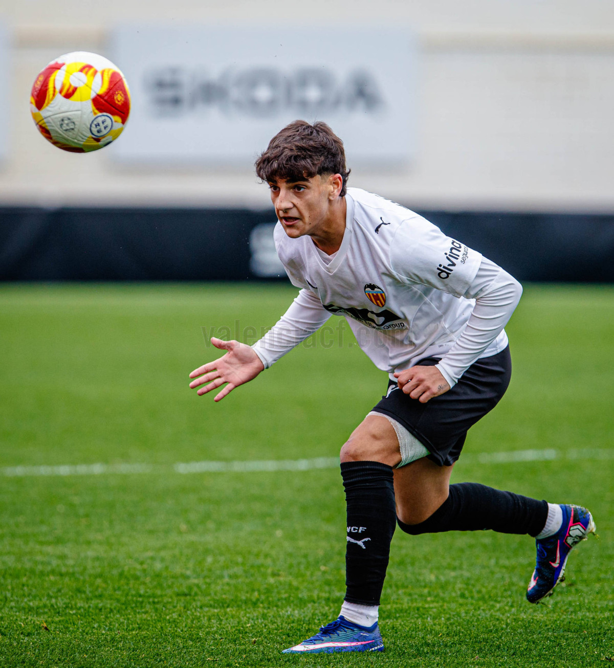 Seguía insistiendo el VCF Mestalla que encontró camino por la banda izquierda en la que Marcos Navarro provocó una falta lateral que Mario Domínguez lanzó sin consecuencias, pero en la continuación y tras centro de Lucas Núñez tuvo el gol en un remate a bote pronto que salió por encima del larguero.
