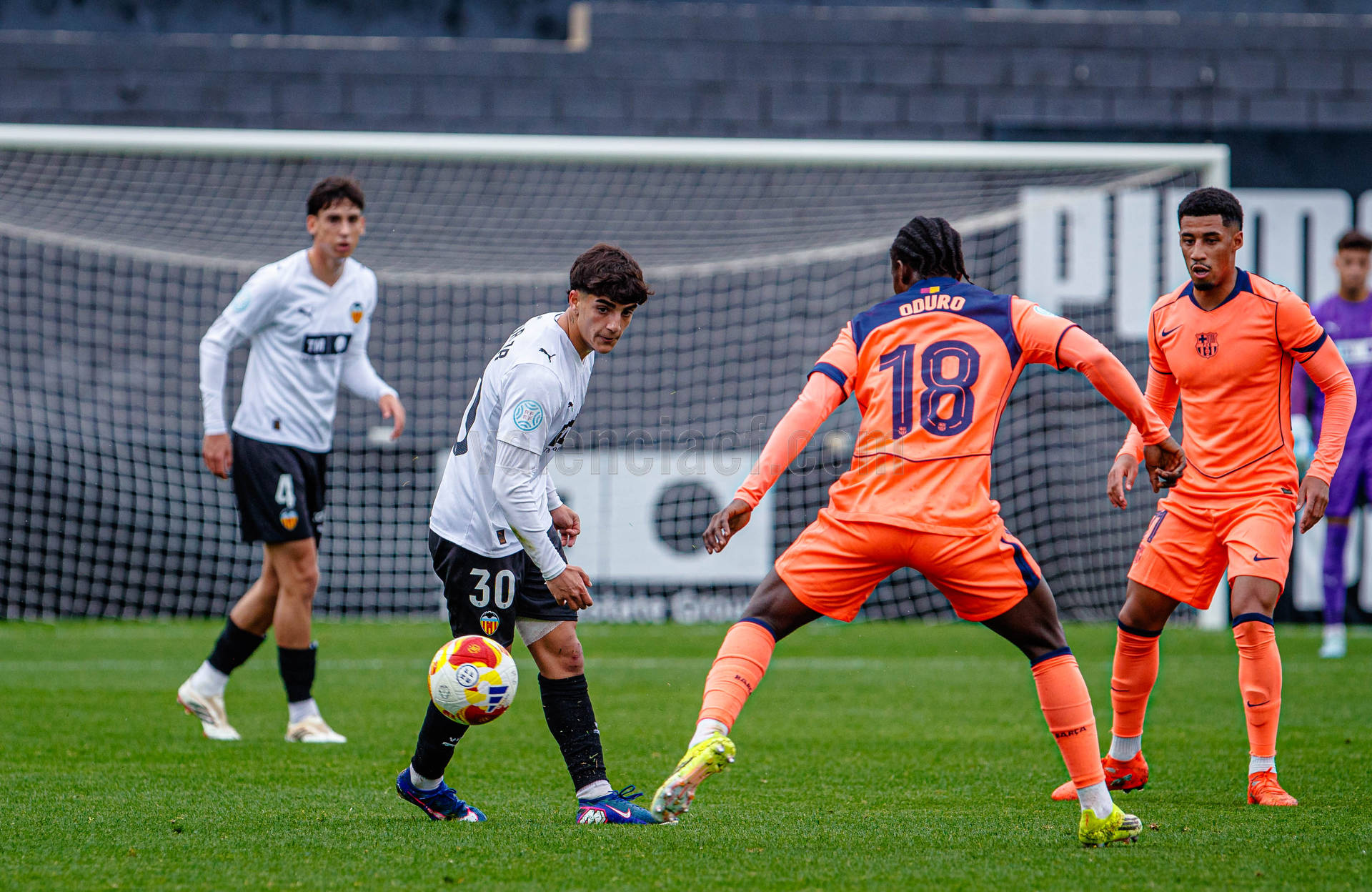 En los minutos finales hubo de intervenir nuevamente Vicent Abril para frenar con acierto un mano a mano con Joaquín Delgado, y un minuto después Guillem envió un lanzamiento al travesaño. La tuvo también el VCF Mestalla en un centro envenenado de Rodrigo Gamón que a punto estuvo de introducirse en su propia portería un defensor blaugrana.
