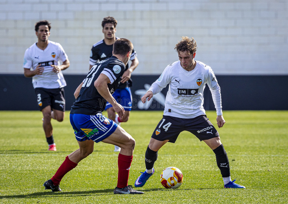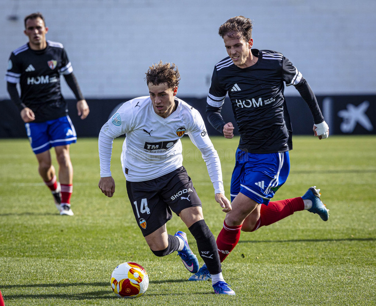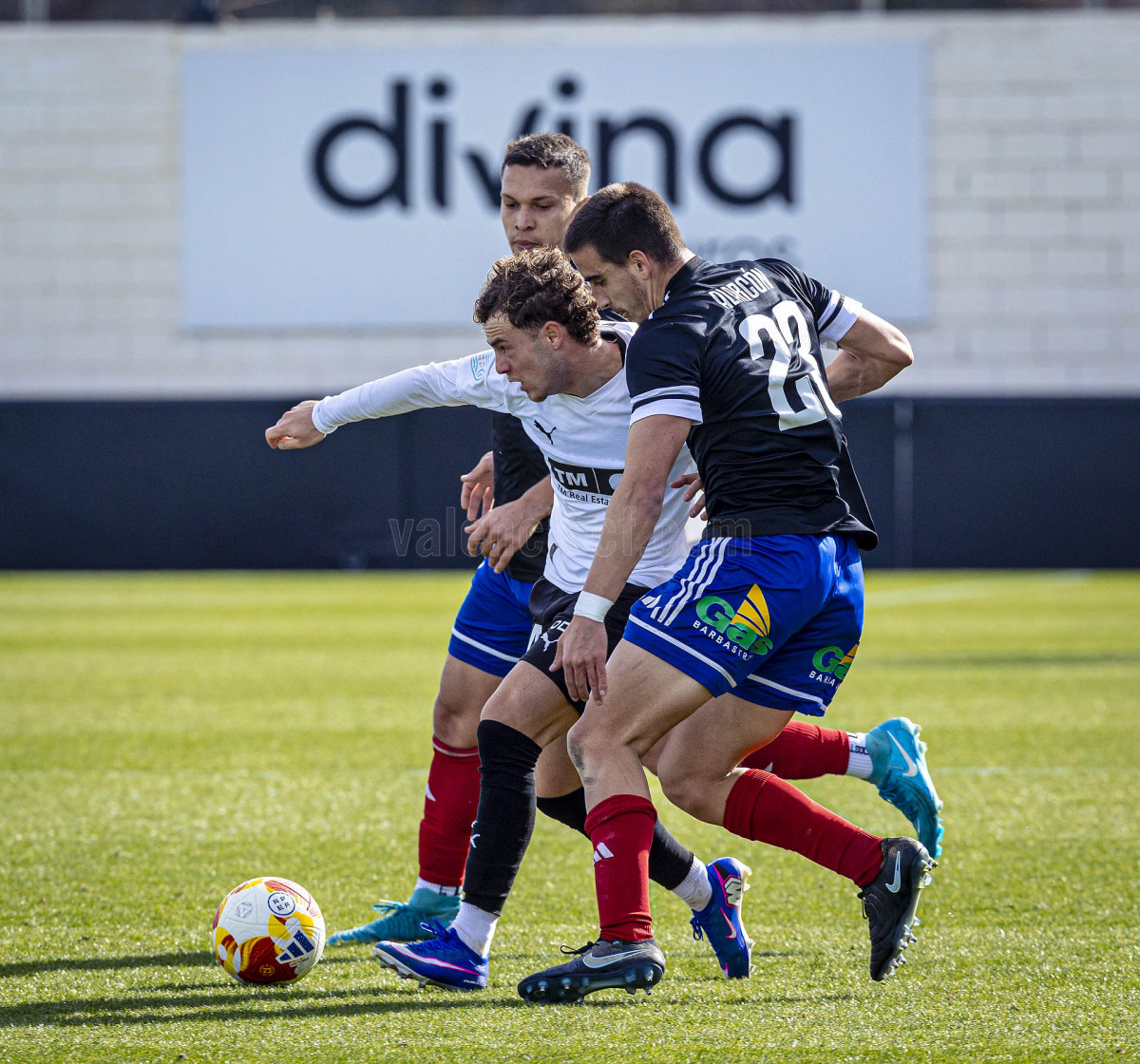 El conjunto de Miguel Ángel Angulo trataba de jugar y combinar ante una UD Barbastro que, con el viento a favor, presionaba alto dificultando la salida de balón valencianista que en esos primeros momentos encontró un par de incursiones de Otorbi por banda derecha como mejores opciones.