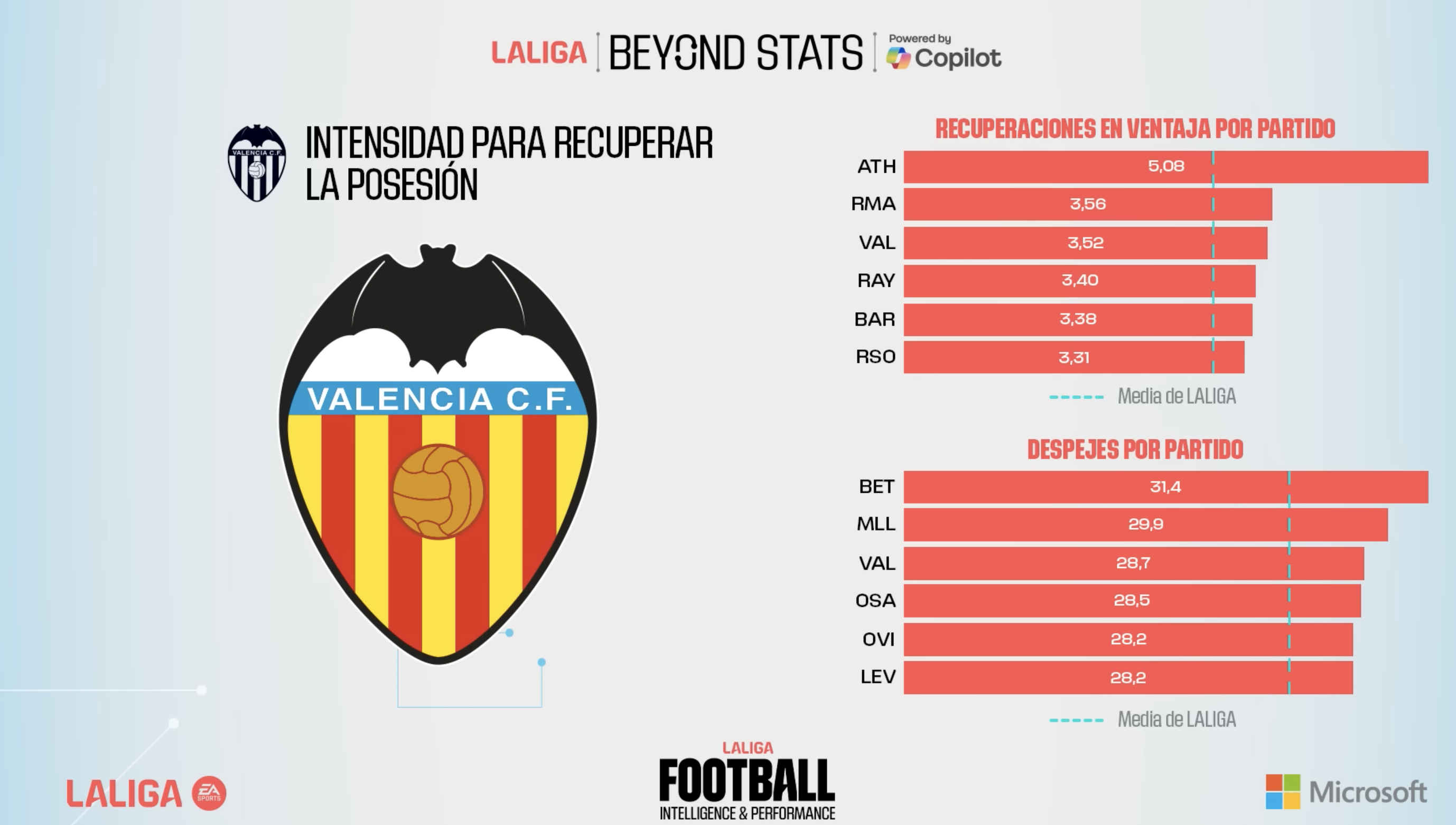 D'altra banda, el Valencia CF també destaca a l'anàlisi de recuperacions en avantatge -més companys que rivals per davant de la pilota en direcció a la meta rival- per partit (tercer amb 3,52) i en la variable de rebutjos per partit (tercer amb 28,7).