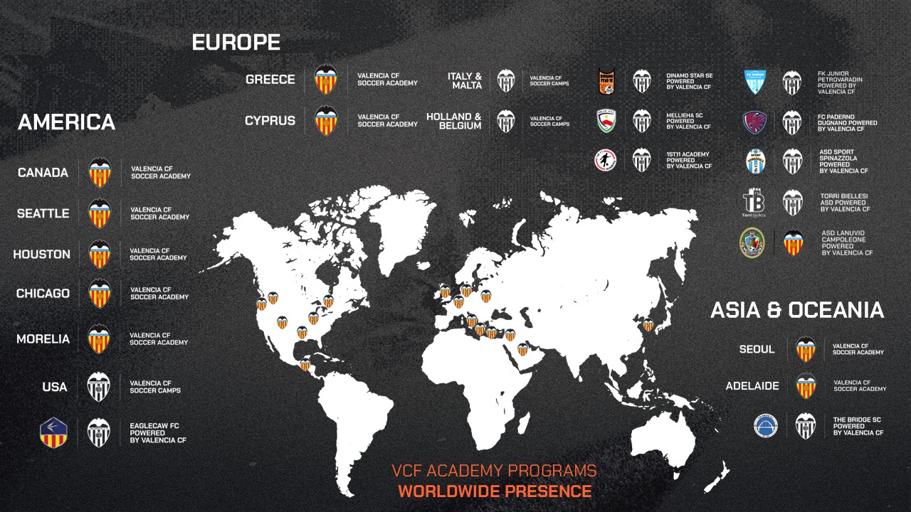 El Valencia CF cuenta actualmente con VCF Academies en México, EEUU, Canadá, Grecia, Chipre, Corea del Sur y Australia, así como proyectos permanentes en Inglaterra, Países Bajos, Bélgica, Italia o Malta, Arabia Saudí, Hungría o Serbia, entre otros, además de los VCF Camps que realiza por los cinco continentes.