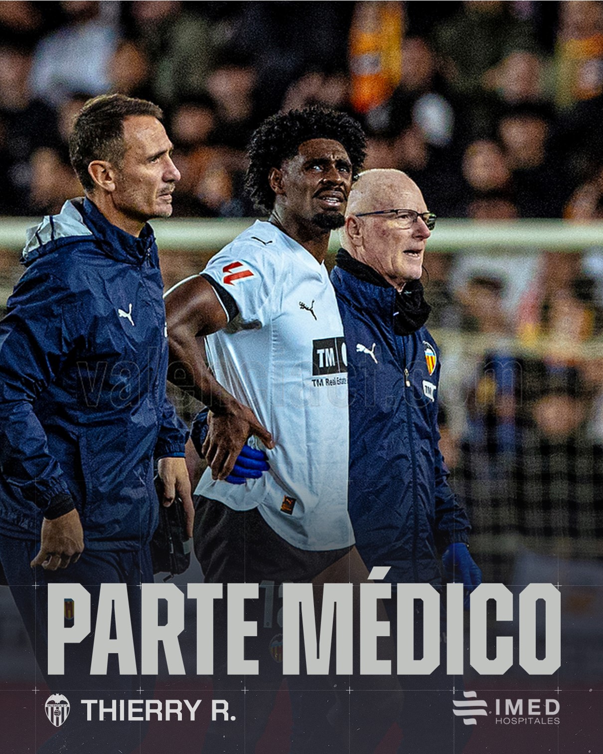 Tras las pruebas realizadas, el jugador del Valencia CF, Thierry Rendall, padece una lesión de la musculatura isquiotibial de su pierna izquierda, sufrida durante el partido de este sábado frente al Elche CF.