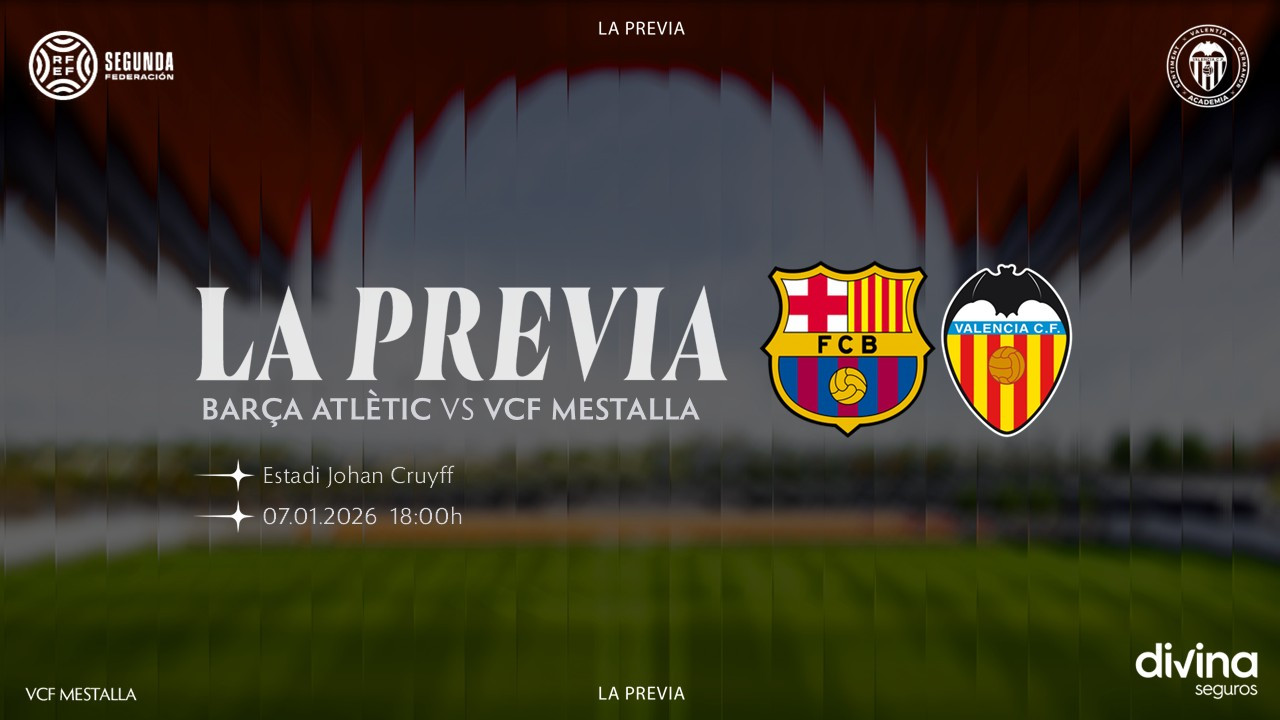 El VCF Mestalla quiere estrenar su casillero de victorias de 2026 este miércoles ante el Barça Atlétic en un duelo de filiales previsto para las 18:00 horas (en directo por VCF Media Radio, App y web VCF) en el Estadi Johan Cruyff con el que se cerrará la primera vuelta de la competición. Este partido corresponde a la Jornada 15 de Segunda Federación Grupo 3, pero se aplazó el pasado mes de diciembre por una alerta meteorológica que impidió el desplazamiento valencianista.