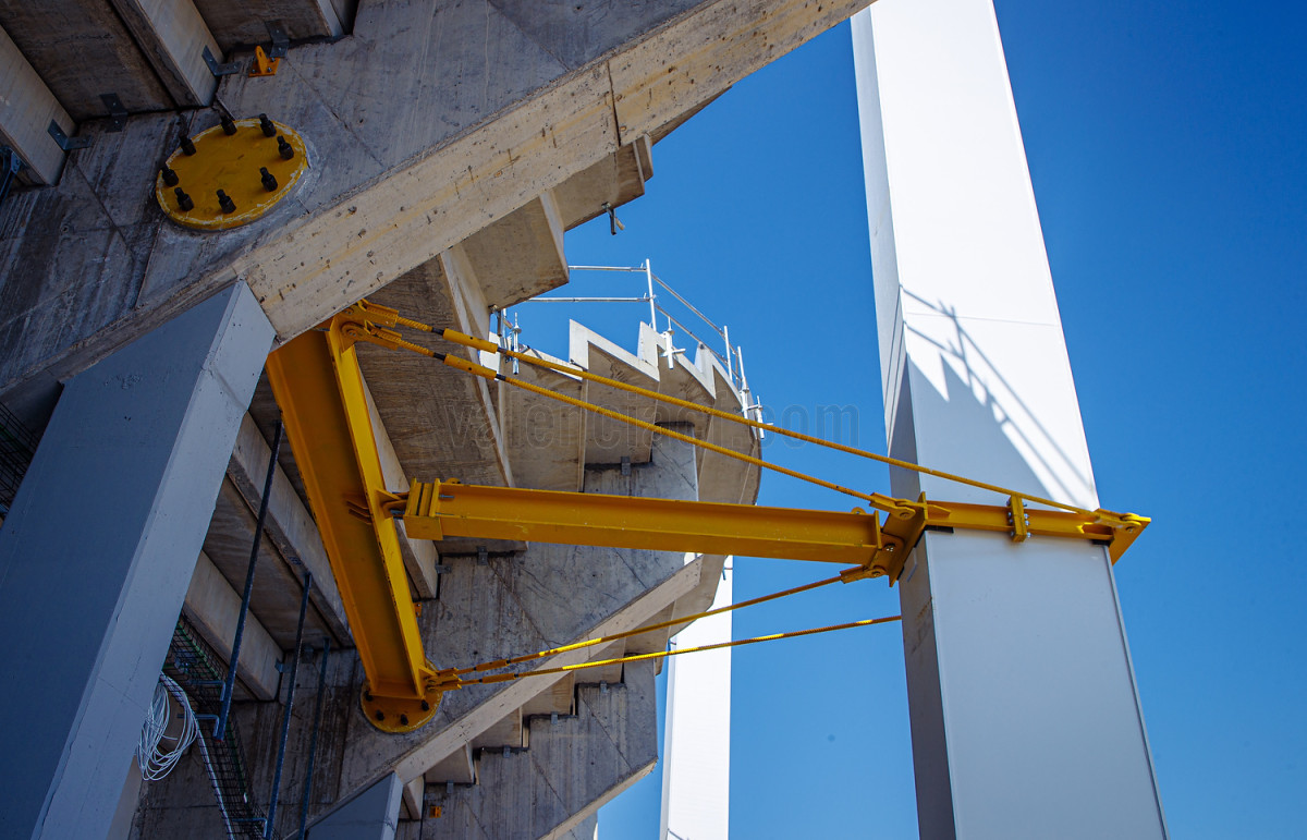 Currently, Valencia CF, together with FCC Construcción, is working on assembling the roof structure. The companies Horta Coslada and PFEIFER are developing the support structure (“bird’s nests” on each pillar to allow cable tensioning, scaffolding, and stand protections) for the large roof, which will weigh 4,800 tons and be supported by 50 S355 steel pillars. It will also serve as a hub for green energy thanks to the implementation of a photovoltaic installation by Octopus Energy – Sustainable Founding Partner.