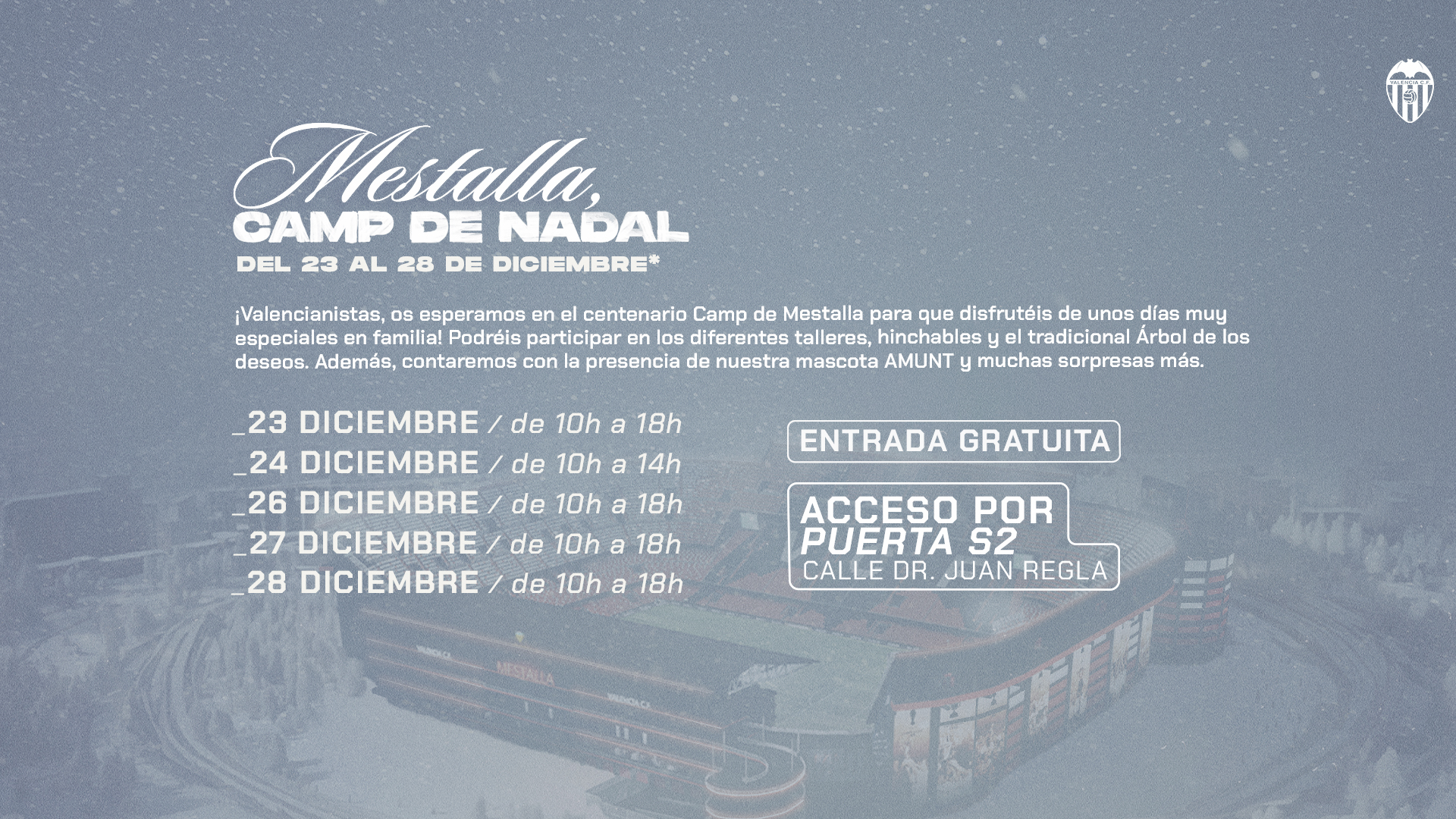 From today at 10:00 a.m., you can already enjoy some of the activities of this great Valencia CF event: face-painting workshops, inflatable attractions, a photo call with the mascot AMUNT, a 360º camera, and much more. In addition, on December 24 we will receive a visit from Santa Claus, with whom the youngest fans will be able to take photos in the stadium corner.