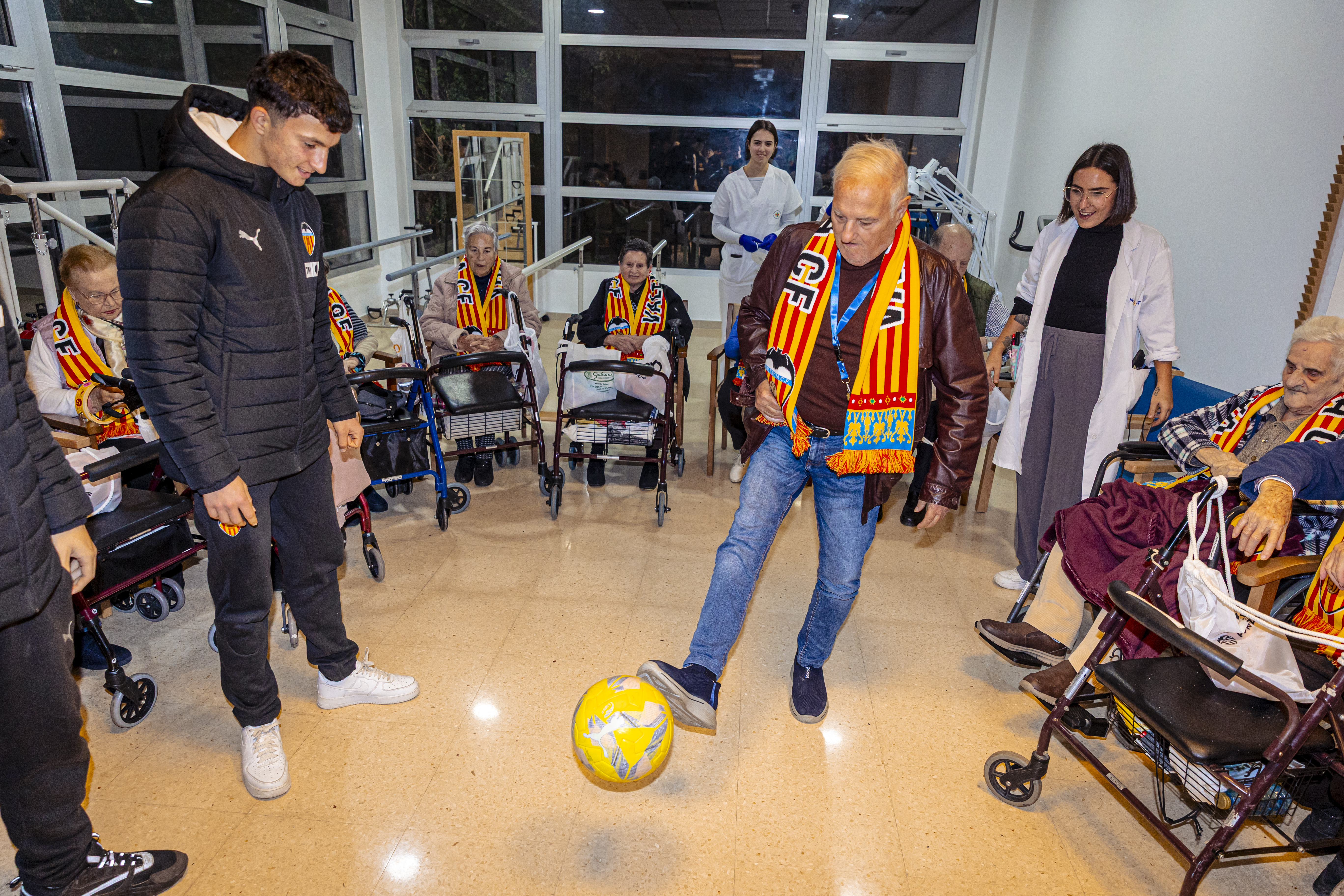 Durante unas horas, l@s jugador@s de la Academia VCF revolucionaron el centro y alegraron la jornada tanto a los mayores residentes como a los trabajadores de un centro que ya funciona a pleno rendimiento tras verse afectado el pasado año por la trágica DANA del 29 de octubre.