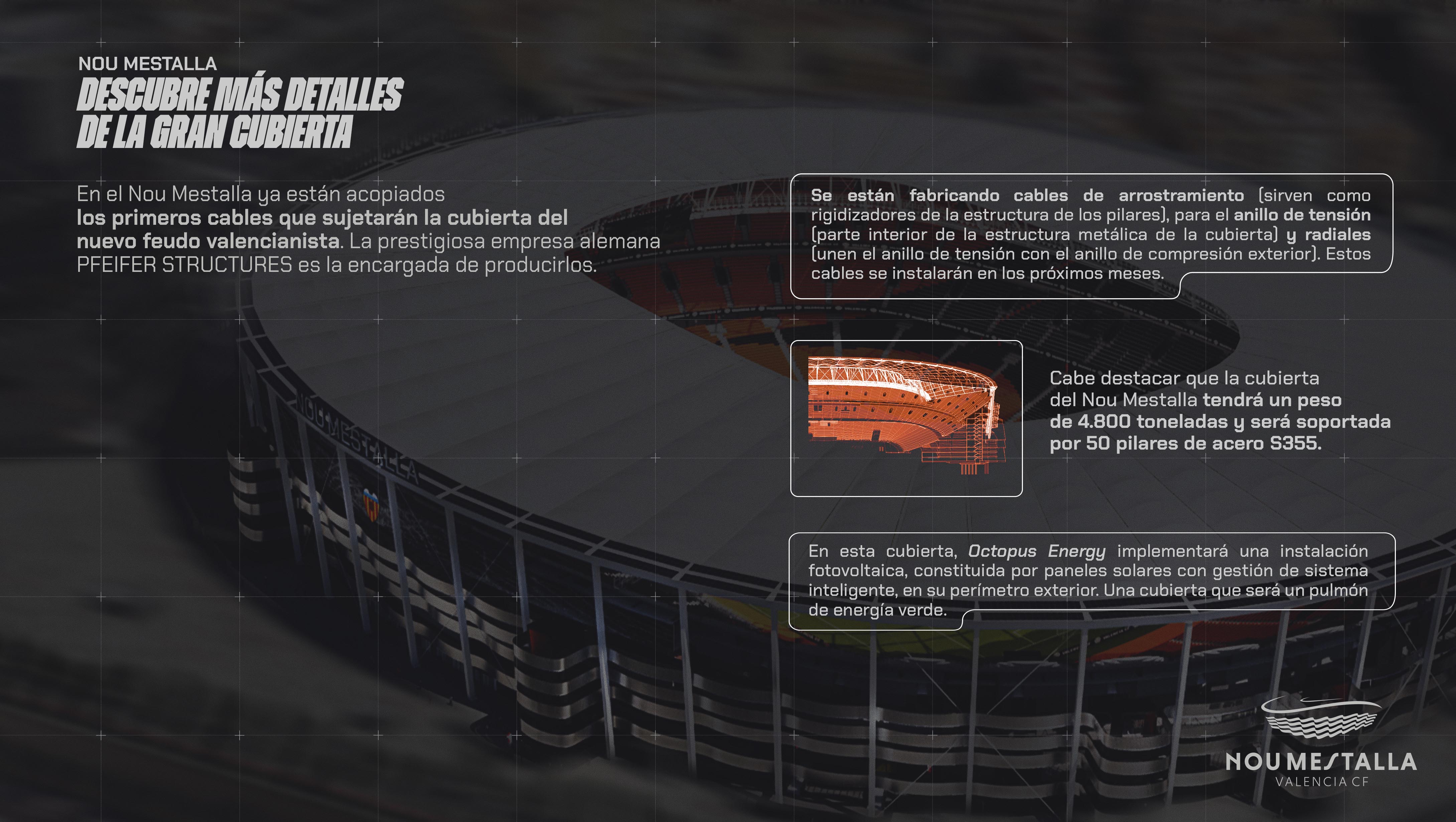Cabe destacar que la cubierta del Nou Mestalla tendrá un peso de 4.800 toneladas y será soportada por 50 pilares de acero S355. Además, en esta cubierta Octopus Energy -Sustainable Founding Partner- implementará una instalación fotovoltaica, constituida por paneles solares con gestión de sistema inteligente, en su perímetro exterior. Una cubierta que será un pulmón de energía verde.